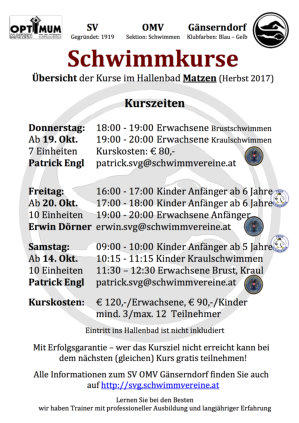 Hallenbad Matzen (Optimum)Jubiläumsplatz 92243 MatzenEingang vom Parkplatz beim KreisverkehrGebäudeteil von der Hauptschule!Trainingstage:Montag und Mittwoch (nicht in den Ferien), von Mitte/Ende Sep. bis Mitte Juni - nur Kinder!Schwimmkurse:ittwoch, ab Okt.: Anfänger Kinder,Freitag, ab Ende Sept.: Anfänger Kinder, ErwachseneSamstag, ab Okt.: Anfänger Kinder